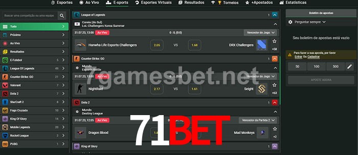 O 71Bet oferece uma grande seleção de opções de apostas em e-sports com probabilidades competitivas